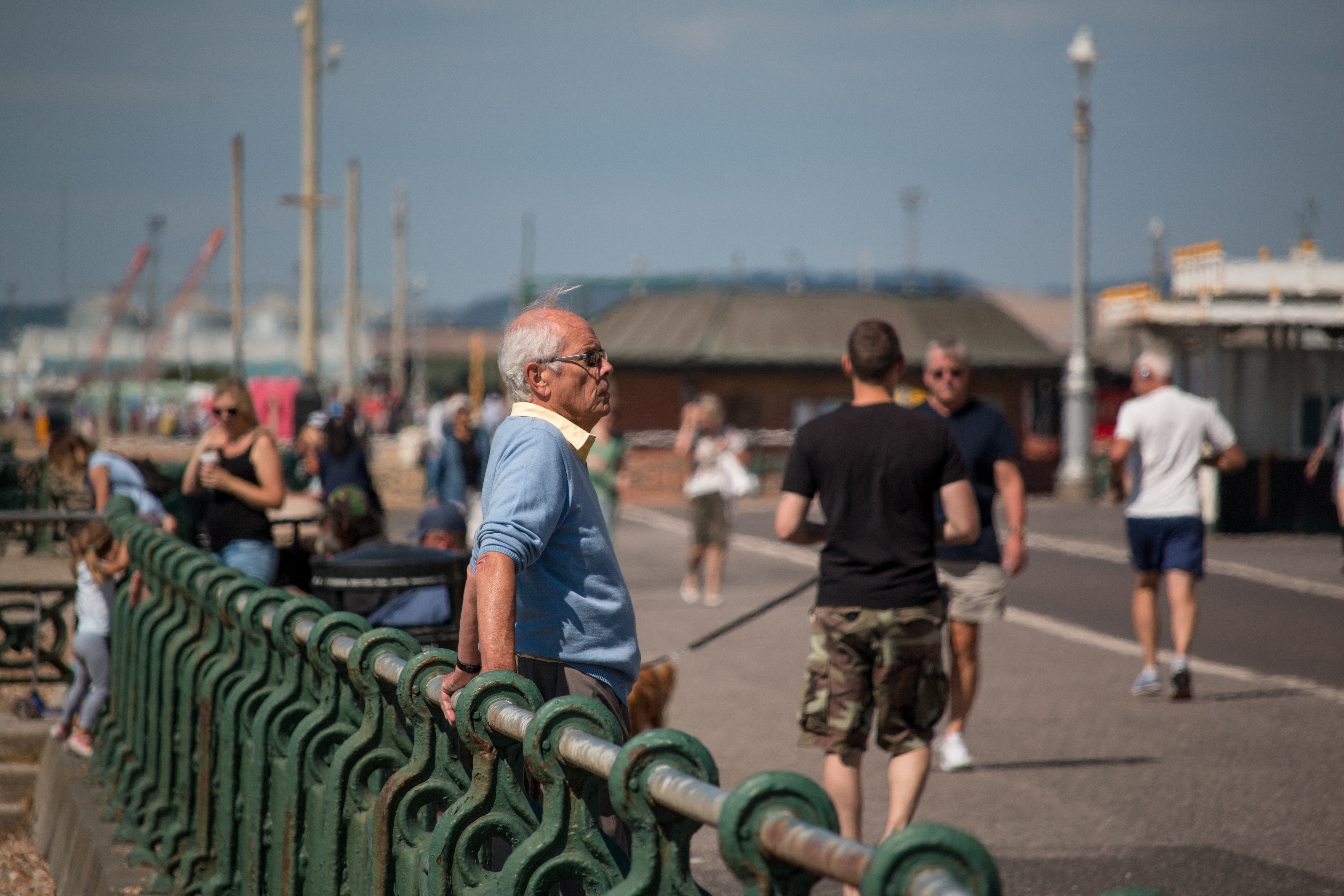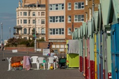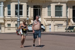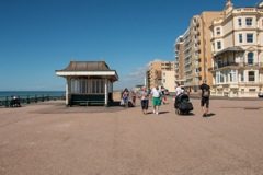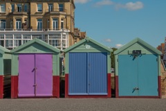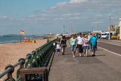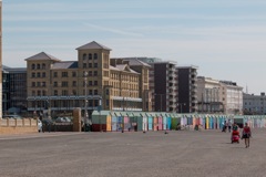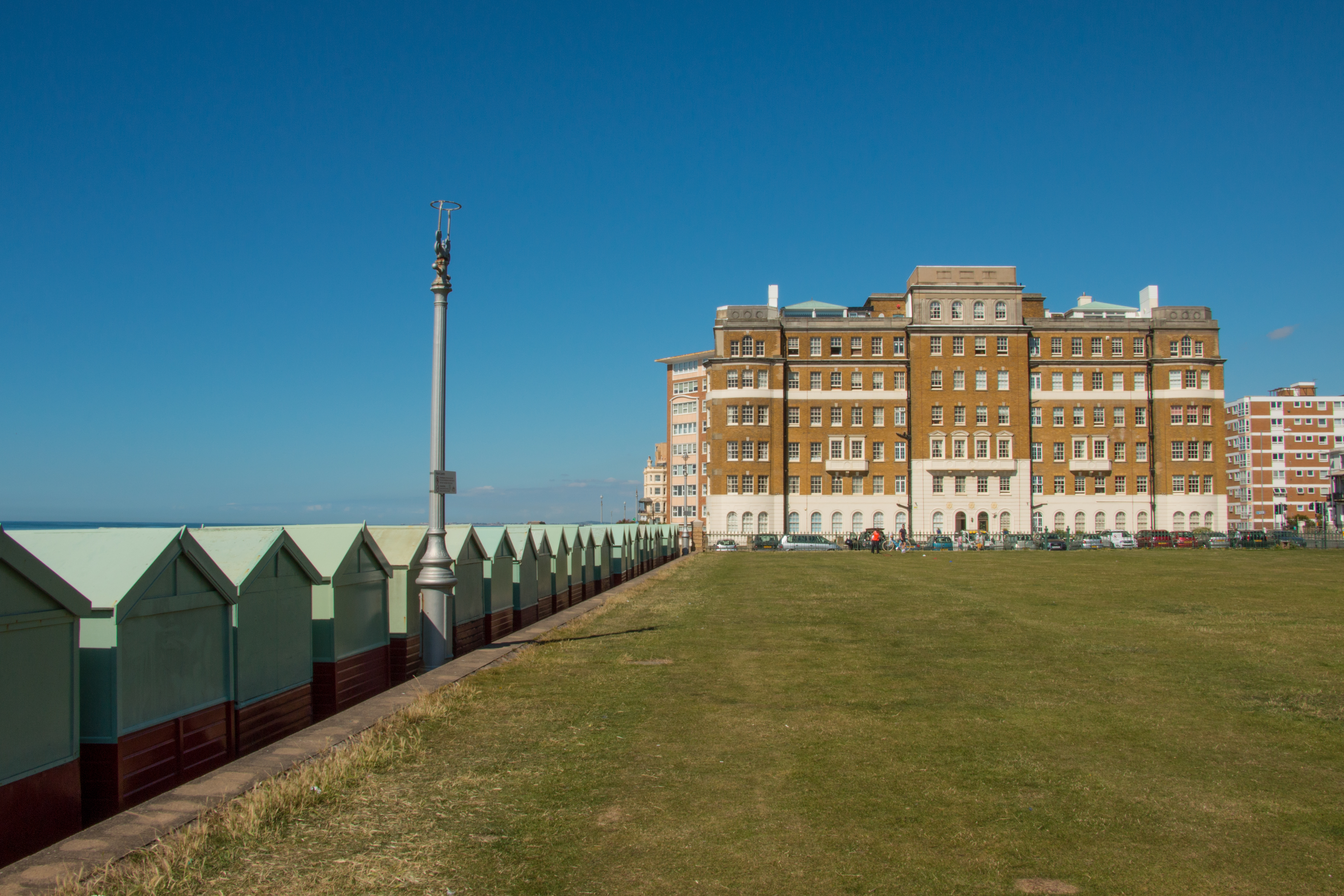 Edwardian buildings, grassy lawns, beach huts, a wide promenade, and a